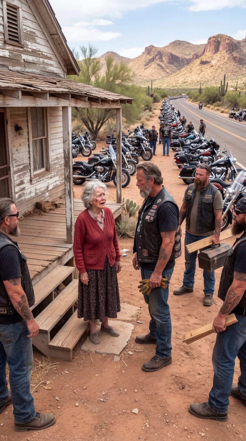 Seventy-two-year-old Eleanor Whitford stood on the narrow wooden porch of her aging house, watching the sky darken over the distant hills. The wind carried the sharp scent of rain mixed with desert dust, and she pulled her worn cardigan tighter around her shoulders.