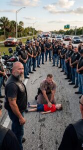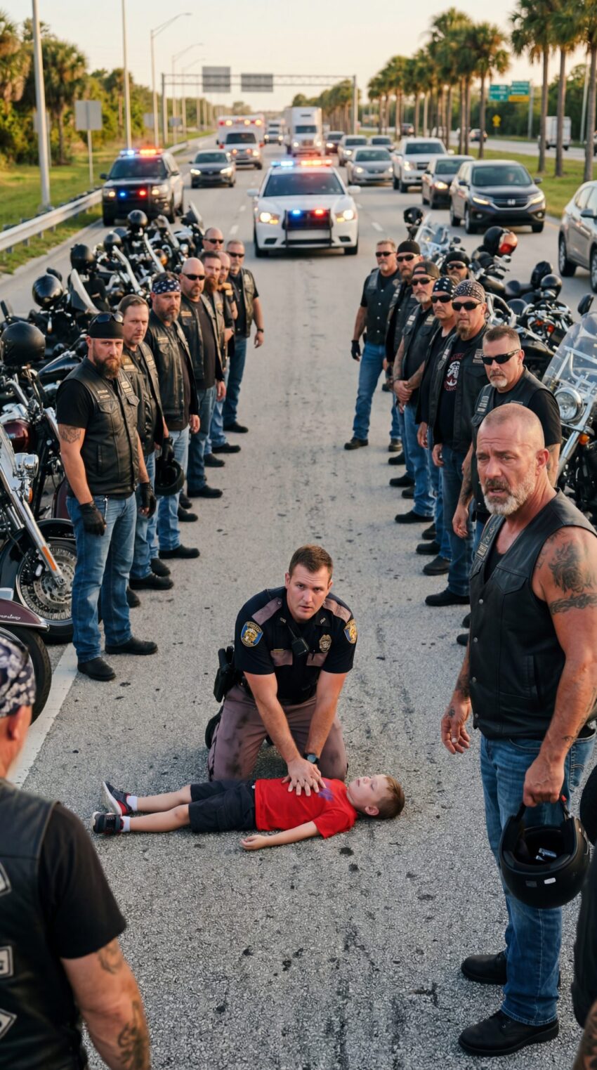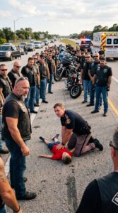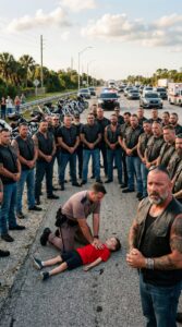 At 4:18 on a humid Thursday afternoon in Polk County, Florida, traffic slowed along County Road 12 beneath a sky heavy with late-summer clouds. A patrol SUV sat angled across the shoulder, red and blue lights flashing against the dull shimmer of asphalt. Drivers eased off their gas pedals out of instinct. A few lifted their phones. From a distance, the scene looked tense: a uniformed officer on his knees in the road and motorcycles arriving in a low, steady rumble.