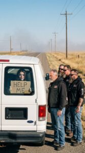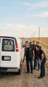 Four Weathered Bikers Paused on a Quiet Country Road as a Rusted White Van Passed By — Until an Eight-Year-Old Girl Pressed a Shaking “Help Me” Sign Against the Dirty Window and One Look Made Them Refuse to Keep Driving