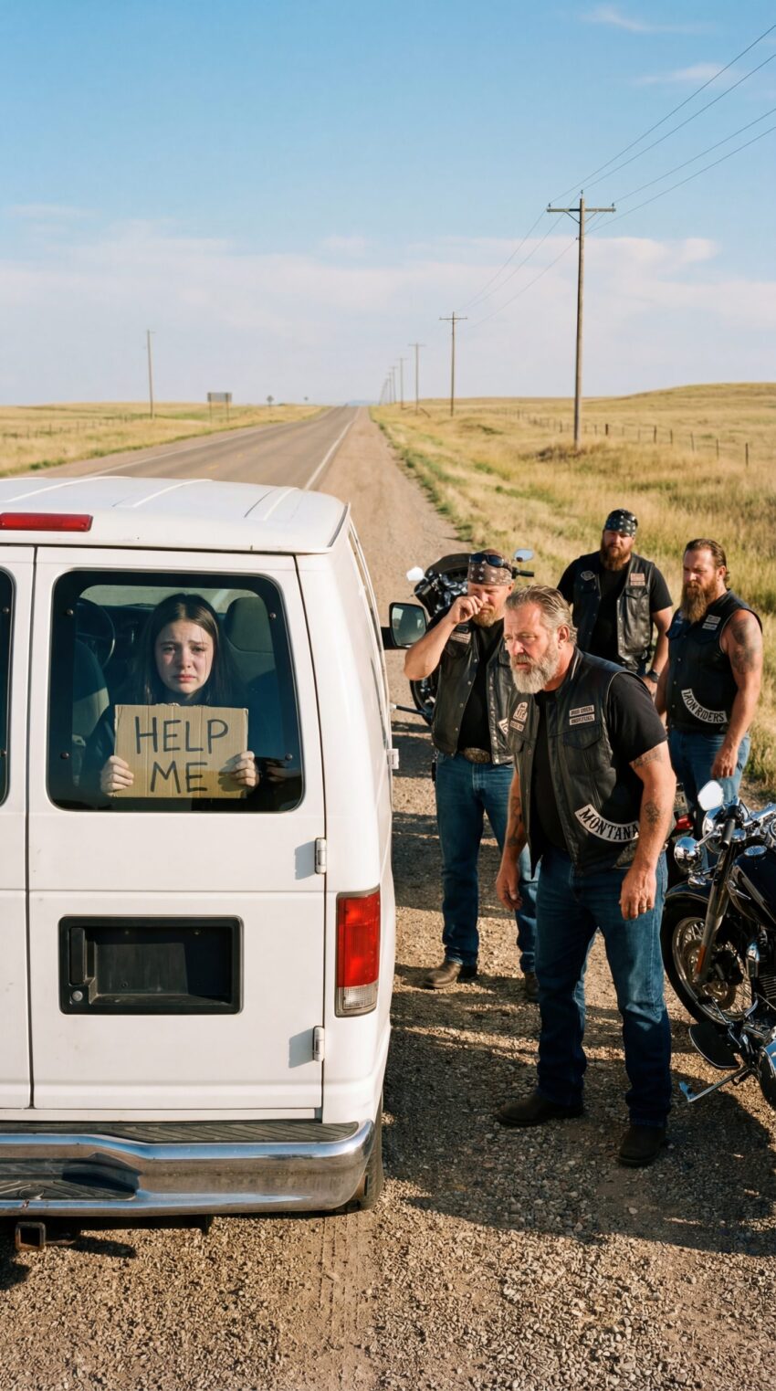 • Four Weathered Bikers Paused on a Quiet Country Road as a Rusted White Van Passed By — Until an Eight-Year-Old Girl Pressed a Shaking “Help Me” Sign Against the Dirty Window and One Look Made Them Refuse to Keep Driving