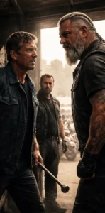 The leader dismounted first. He was massive, his presence alone enough to shift the air around him. His beard was streaked with gray, braided tightly, and the patch on his vest marked him as someone who didn’t ask for respect—he took it.
