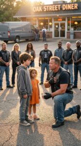 The back parking lot of Harper’s Diner in Brookfield, Indiana, was the kind of place most people ignored. At sunset, it carried a quiet, worn-out beauty—oil stains darkening the asphalt, the soft hum of an aging neon sign, and the faint smell of grilled food drifting through the air.