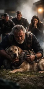 He staggered forward, coughing violently, barely able to stay upright. Wrapped in his leather vest, clutched tightly against his chest, was a golden retriever—its eyes cloudy, its body limp.