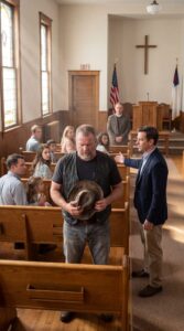 He stood near the last row, holding his hat in both hands. His boots were worn but clean. His plain dark shirt was neatly buttoned. Over it, he wore a leather vest softened by years of weather and long roads. It looked old, not neglected. Used, not careless. But people did not see the difference. They only saw the vest.