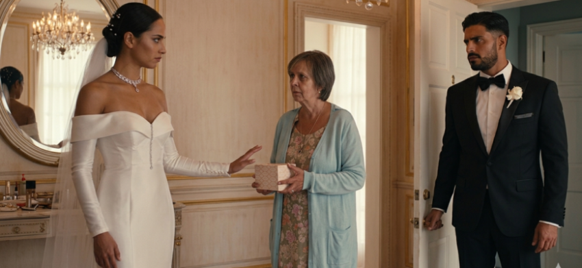 The scene opens inside a luxurious room filled with golden details. A bride, stunning in her elegant off-the-shoulder mermaid gown, admires herself confidently in the mirror. Just a step away stands another figure: an older woman, simply dressed in a floral outfit and a modest blue cardigan, carefully holding a small gift.