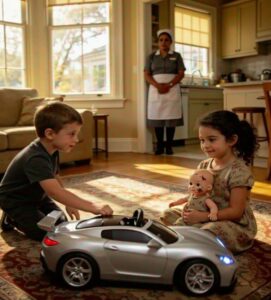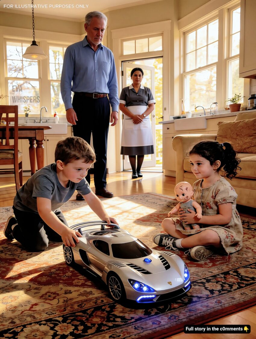 Near the wide bay window, his three-year-old son, Ethan, knelt on the Persian rug, pushing a sleek silver race car in precise loops. The toy’s glossy surface flashed in the light; soft electronic chimes rang every time he pressed a button. Tiny blue lights blinked with mechanical cheerfulness.