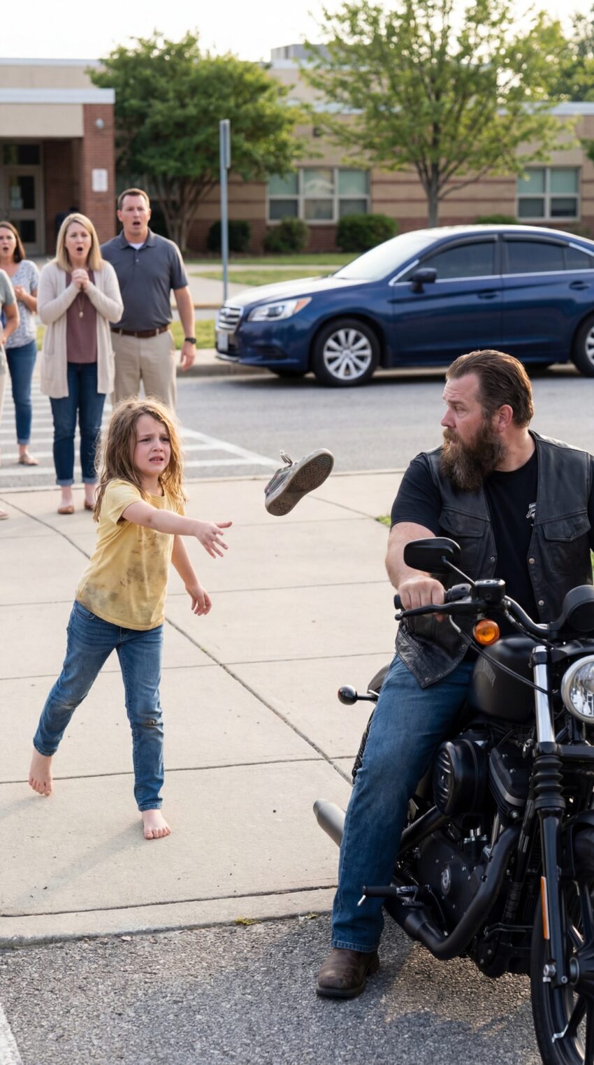 He was parked near the sidewalk, a little away from the main entrance, where he could see the school but did not seem interested in calling attention to himself. His engine was off. His gloved hands rested loosely on the handlebars. He wore a faded leather vest over a gray shirt, dark jeans, and boots that looked as though they had crossed half the country. He had a broad frame, tired eyes, and the kind of stillness that made people uncomfortable when they did not know how to read it.