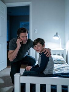 I moved before my brain caught up, scooping my son from his bed, carrying his warm weight downstairs. In the guest room, I eased him onto the quilt, then stepped to the window.