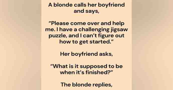 A blonde calls her boyfriend and says, “Please come over and help me. I have a challenging jigsaw puzzle, and I can’t figure out how to get started.”