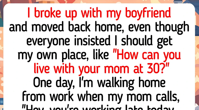 I broke up with my boyfriend and moved back home, even though everyone insisted I should get my own place, like “How can you live with your mom at 30?” One day, I’m walking home from work when my mom calls, “Hey, you’re working late today, right?”