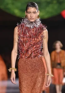 The creativity extended to the more avant-garde with Thom Browne’s surreal backstage look: a model wearing a green alien-inspired headpiece with six sleeves and legs, transforming a classic gray flannel suit into a futuristic, cinematic statement. Miu Miu’s show emphasized aprons reimagined in leather, while Chanel’s collection featured a brown dress with bold spike-like embellishments, blending traditional tailoring with edgy design elements.