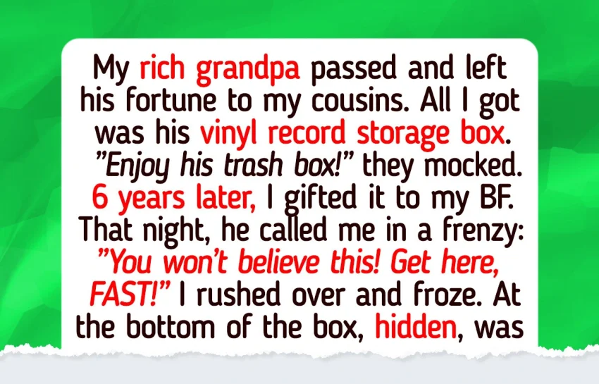 My rich grandpa passed and left all his fortune to my cousins. All I got was his old vinyl record storage box. “Enjoy his trash box!” they mocked me.