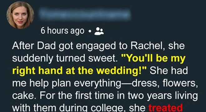 Do you know that feeling when someone is acting “too” nice? Like they’re overcompensating for something? That was Rachel, my stepmother. And I’m still crushed by what she did on the day she married my dad.