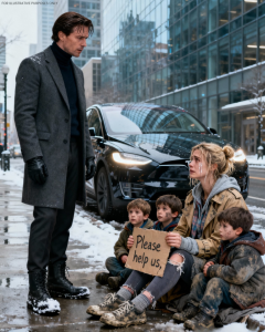 Near the curb, wrapped in a thin blanket, sat a woman with three small children pressed close to her for warmth. The woman held a cardboard sign that read, Please help us. Anything helps. The sight alone was heartbreaking, yet what froze Liam completely was her face.