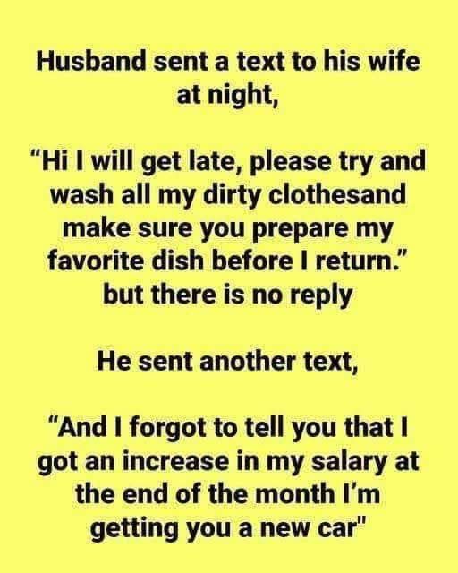 A husband texted his wife late one evening to ask her to make his favorite meal and wash his clothes before he came home. He texted her again after receiving no response, stating that he had received a pay raise and intended to purchase a new automobile for her. “OMG, really?” was his wife’s horrified response. “No, I just wanted to make sure you got my first message,” he remarked shrewdly. His rapid thinking gave their talk a lighthearted edge.