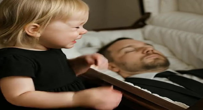 During her father’s funeral, a little girl looked at the coffin and shouted that daddy was just sleeping — and at that moment, the guests discovered something horrifying The funeral proceeded as usual — slow, solemn, and silent, broken only by muffled sobs and the priest’s words. In the center of the hall stood a coffin lined with white fabric. Inside lay a young man, taken too soon by a tragic accident. Standing nearby was his wife, pale and distant, and their young daughter — a two-year-old girl in a black dress.