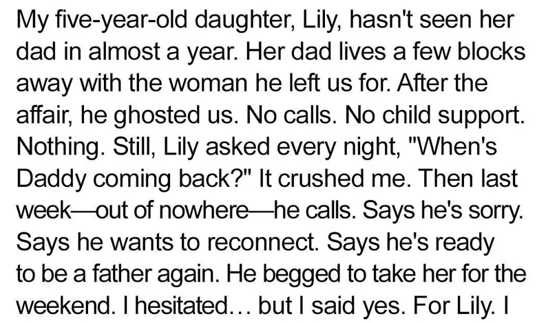When my ex-husband, Leo, said he wanted to reconnect with our daughter Lily after three years of silence, I wanted to believe him. He said he wanted “a weekend to make things right.” Against my better judgment, I packed Lily’s little yellow backpack with pajamas, snacks, her teddy bear, and her favorite dress. A small, hopeful part of me — the part that still remembered the way he cried the day she was born — dared to think he might finally be ready to be her father.
