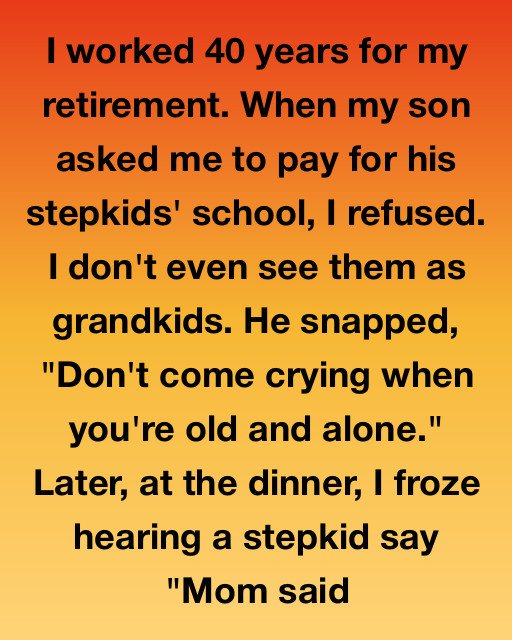 He called one afternoon, voice tight like he was trying to sound casual but wasn’t even close. He said he needed me to pitch in for his stepkids’ private school tuition. They weren’t my grandkids. I’d never pretended they were. We didn’t have that kind of bond, mostly because he’d married their mother, Julia, when they were already half-grown and barely looked my way when I visited.