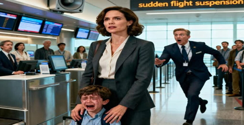 My son began to cry, clutching my hand. I didn’t argue—I just pulled out my phone and sent one message. Five minutes later, the airport speakers crackled: “Attention: this flight is suspended indefinitely by order of the Security Command.” The airport manager came running, drenched in sweat. “Ma’am,” he stammered, “there’s been… a terrible mistake.”