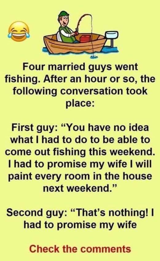 The third guy, who was paying close attention, added his own story. He told them, “You both have it easy!” “I promised my wife that I would redo the whole kitchen for her.” I know it will be a lot of work, but I just had to join you guys on this fishing trip.”